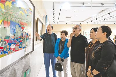 8月12日,觀眾在參觀畫作。當日,“石榴結碩果 和美新時代”第三屆民族地區五城市美術作品交流展在呼和浩特市文化館開展。展覽匯聚南寧、呼和浩特、喀什、銀川、山南五地的100幅優秀美術作品,涵蓋中國畫、油畫、水彩畫等多個門類,內容聚焦民族團結進步、鄉村振興、城市建設、民俗風情四大主題。記者 王磊攝