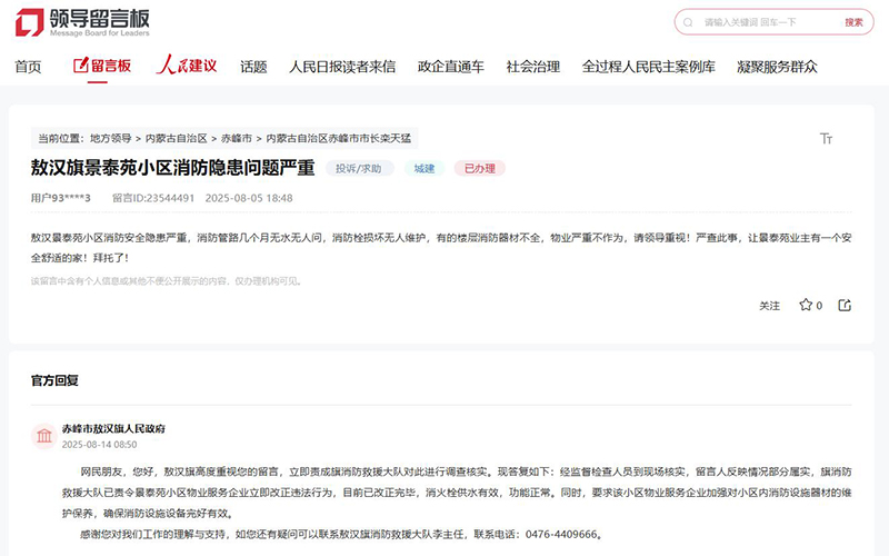 收到留言后,赤峰市敖漢旗人民政府回復(fù),敖漢旗高度重視,立即責(zé)成旗消防救援大隊(duì)對此進(jìn)行調(diào)查核實(shí)。經(jīng)監(jiān)督檢查人員到現(xiàn)場核實(shí),網(wǎng)友反映情況部分屬實(shí),敖漢旗消防救援大隊(duì)已責(zé)令景泰苑小區(qū)物業(yè)服務(wù)企業(yè)立即改正違法行為,目前已改正完畢,消火栓供水有效,功能正常。同時(shí),要求該小區(qū)物業(yè)服務(wù)企業(yè)加強(qiáng)對小區(qū)內(nèi)消防設(shè)施器材的維護(hù)保養(yǎng),確保消防設(shè)施設(shè)備完好有效。