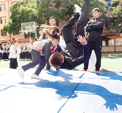 9月17日,在呼和浩特市新城區(qū)八一路小學(xué),學(xué)生在摔跤運動員的指導(dǎo)下體驗摔跤運動。當日,該校舉行“冠軍領(lǐng)航助成長 運動逐夢譜華章”少年摔跤訓(xùn)練基地掛牌儀式。活動中,內(nèi)蒙古重競技運動管理中心的工作人員、摔跤項目運動員與學(xué)校師生親密互動,帶領(lǐng)學(xué)生感受摔跤運動魅力。記者 懷特烏勒斯攝