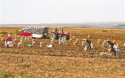 9月26日,在呼和浩特市武川縣哈樂鎮廠漢腦包村,工人正在采收馬鈴薯。今年,呼和浩特市武川縣53萬畝馬鈴薯喜獲豐收,田野間處處洋溢著增收致富的喜悅。據農情調度,截至9月25日,內蒙古秋糧收獲超1500萬畝,較上年同期快0.5個百分點。記者 孟和朝魯攝