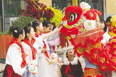 9月28日,呼和浩特市玉泉區(qū)清泉街小學(xué)表演舞獅的學(xué)生和同學(xué)們歡樂互動(dòng)。中秋佳節(jié)將至,該校開展了“品味中秋民俗 傳承節(jié)日文化”主題活動(dòng)?;顒?dòng)中,同學(xué)們?cè)诶蠋煹哪托闹笇?dǎo)下,學(xué)習(xí)制作月餅、拼裝傳統(tǒng)花燈、捏制兔兒爺?shù)葌鹘y(tǒng)技藝,大家通過(guò)沉浸式體驗(yàn)中秋習(xí)俗,深度感受中華優(yōu)秀傳統(tǒng)文化的獨(dú)特魅力。記者 王磊攝