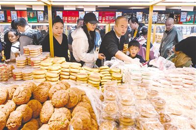 10月2日,在呼和浩特市回民區寬巷子,人們選購傳統手工月餅。中秋節臨近,在呼和浩特市寬巷子美食街內,傳統手工月餅以獨有的口味受到首府市民和游客的青睞。記者 孟和朝魯攝