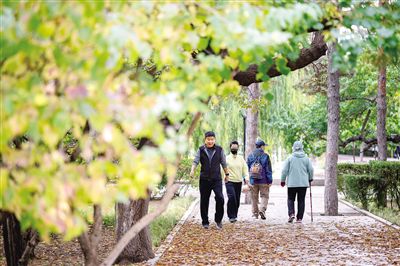10月9日,在秋色浸染的呼和浩特市滿都海公園,市民行走在林間小道上。寒意漸重,秋意正濃。記者從氣象部門了解到,受冷空氣影響,全區(qū)氣溫將持續(xù)走低,預計未來3天,中西部地區(qū)仍有降水,東部地區(qū)有霜凍或冰凍,提醒公眾注意防寒保暖。記者 懷特烏勒斯 攝