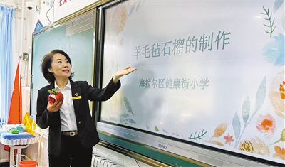 健康街小學立足地域特色,將內蒙古傳統羊毛氈技藝引入校園,打造特色非遺課程。課程原材料均選用呼倫貝爾本地天然羊毛,質地柔軟且帶著草原的質樸氣息。課堂上,老師會帶領學生參與羊毛染色環節,白色羊毛在染料中漸變成天藍、草綠、明黃等色彩,既激發了學生的創作興趣,也讓他們從源頭感受草原文化的鮮活。