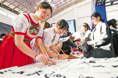 11月1日,來自俄羅斯的留學(xué)生在活動中寫書法。當(dāng)日,為弘揚中華優(yōu)秀傳統(tǒng)文化,促進中外文化交流互鑒,內(nèi)蒙古師范大學(xué)第二屆國際文化節(jié)在賽罕校區(qū)開幕,來自14個國家的1000余名中外學(xué)子歡聚一堂,樂享文化盛宴。本屆國際文化節(jié)以“一帶一路筑夢,文化交融暖心”為主題,突出互動性與參與性,通過各國民俗文化展示、文藝表演、美食體驗等多元形式,搭建起跨文化對話的橋梁。記者 王磊攝