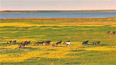 包頭市達茂旗查干哈達蘇木成群的蒙古馬馳騁在騰格淖爾湖畔。