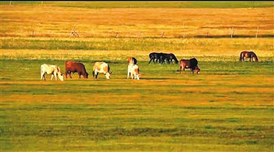 達茂草原上悠閑的牛馬。