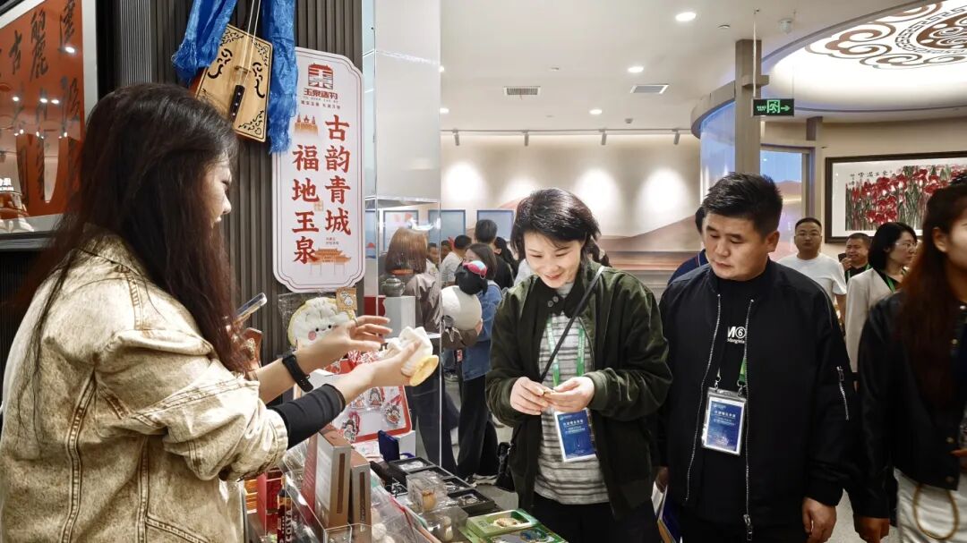 11月8日,觀眾穿梭在玉泉區各展臺間,對著“福地玉泉”周邊等產品細細品鑒,掃碼下單不亦樂乎。工作人員高效講解推介,熱鬧氛圍持續升溫。