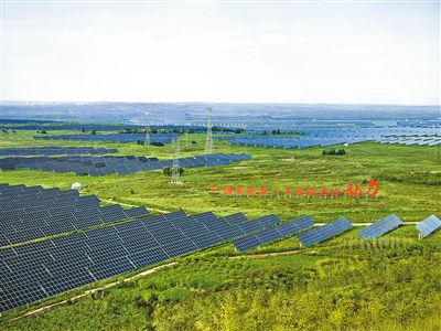 在巴彥淖爾市磴口縣烏蘭布和沙漠東北部的新能源基地,湛藍色的光伏板整齊列陣,雄踞于黃沙之上。板下,草方格固住流沙;板間,梭梭林迎風而生,“藍”與“綠”在此交織共舞。