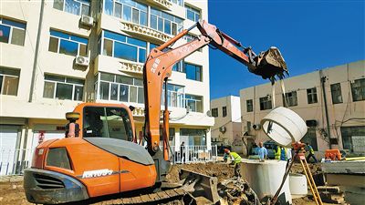 施工人員鋪設排污管道。