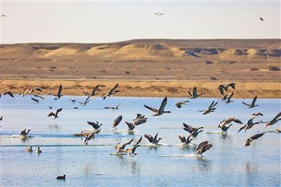12月2日,阿拉善盟額濟納旗東居延海上候鳥翩躚。