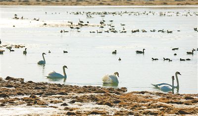 天鵝等候鳥接連來臨,冬日的居延海熱鬧起來。